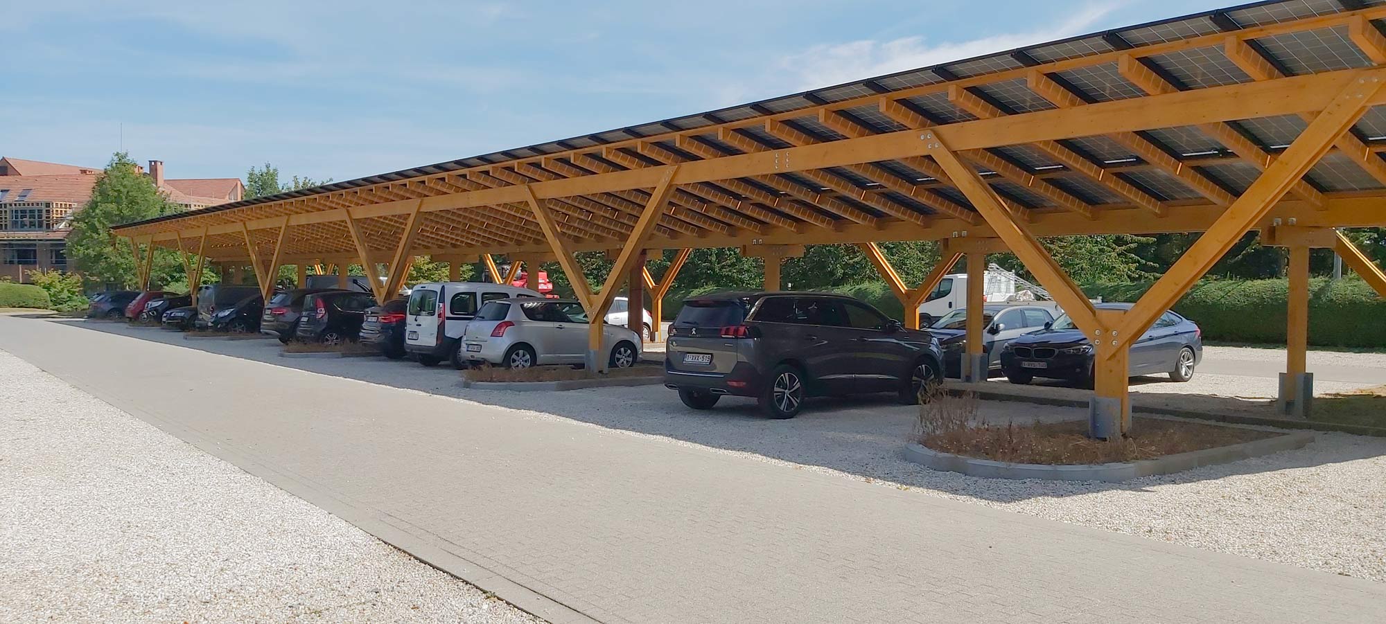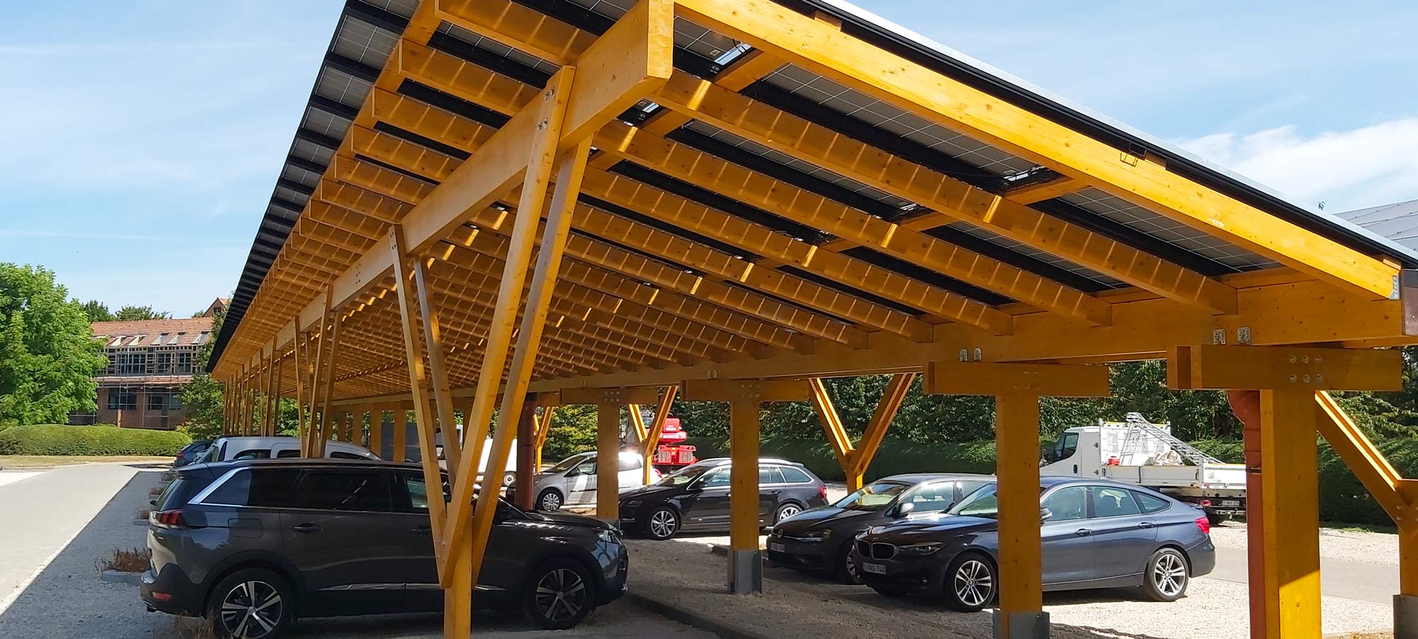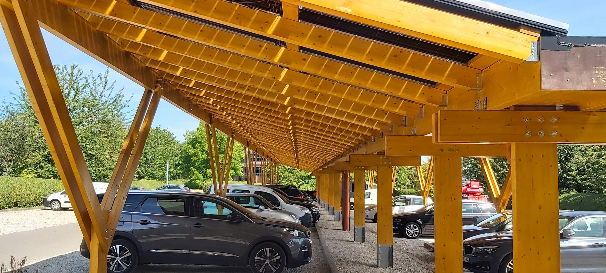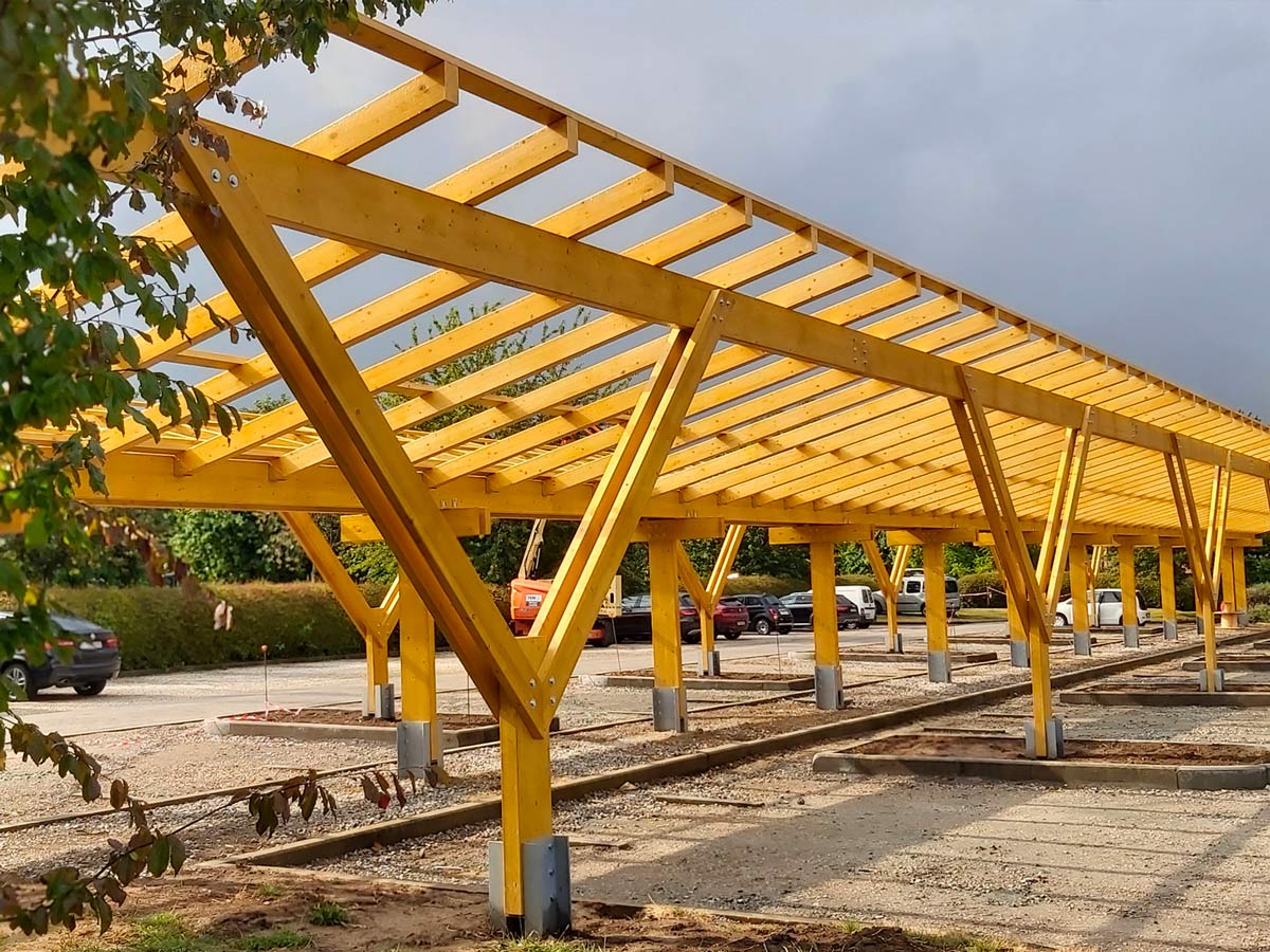 Carport solaire en bois lamellé-collé pour parkings professionnels