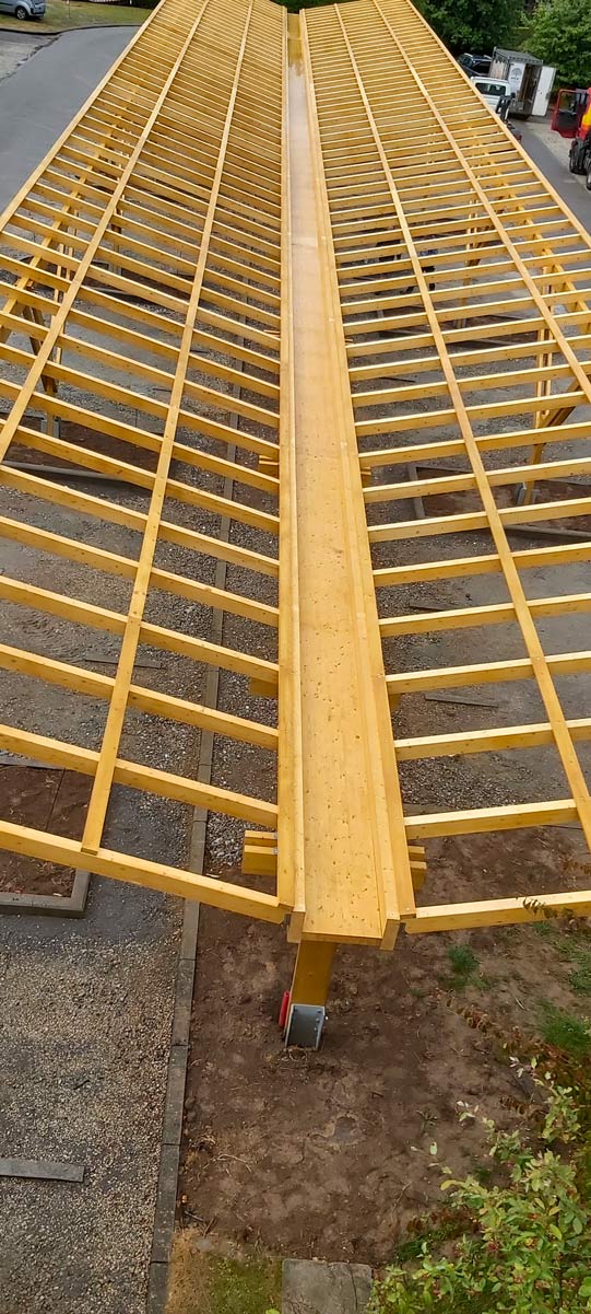 La piscine d’Eupen présente une charpente en lamellé collé d’épicéa, offrant une portée de 28 mètres. Cette structure repose sur une base en béton, garantissant solidité […]Carport solaire en bois lamellé-collé pour parkings professionnels