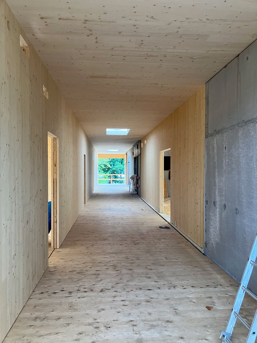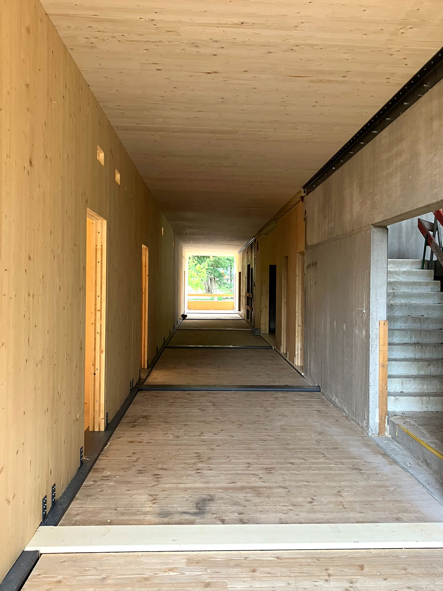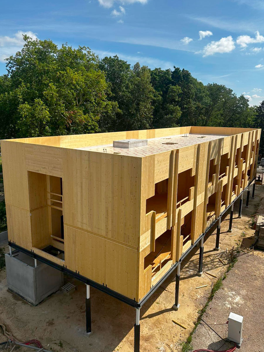 Les photos montrent un ensemble porté par une structure métallique surélevée, créant un rez-de-chaussée dégagé et lumineux. Les parois, planchers et cloisons en CLT composent des espaces intérieurs chaleureux, dotés d’une acoustique naturelle et d’un confort optimal pour les futurs élèves et enseignants. Les ouvertures généreuses assurent une belle lumière naturelle, tout en mettant en avant la flexibilité architecturale du CLT.