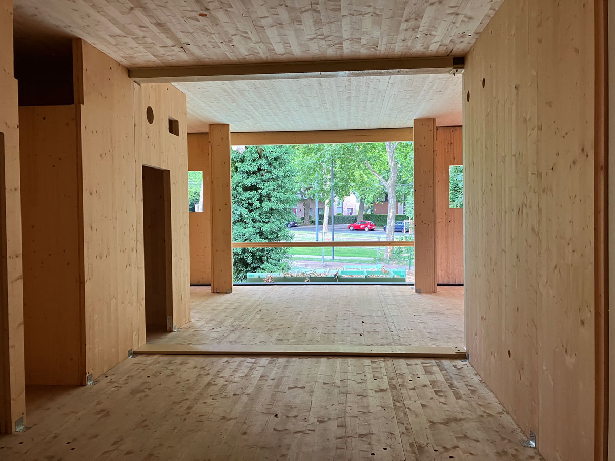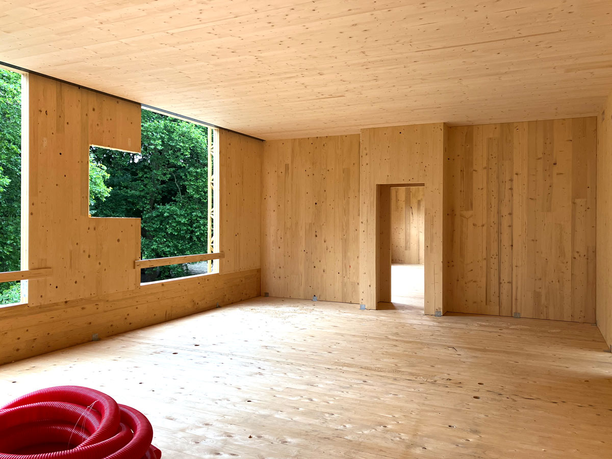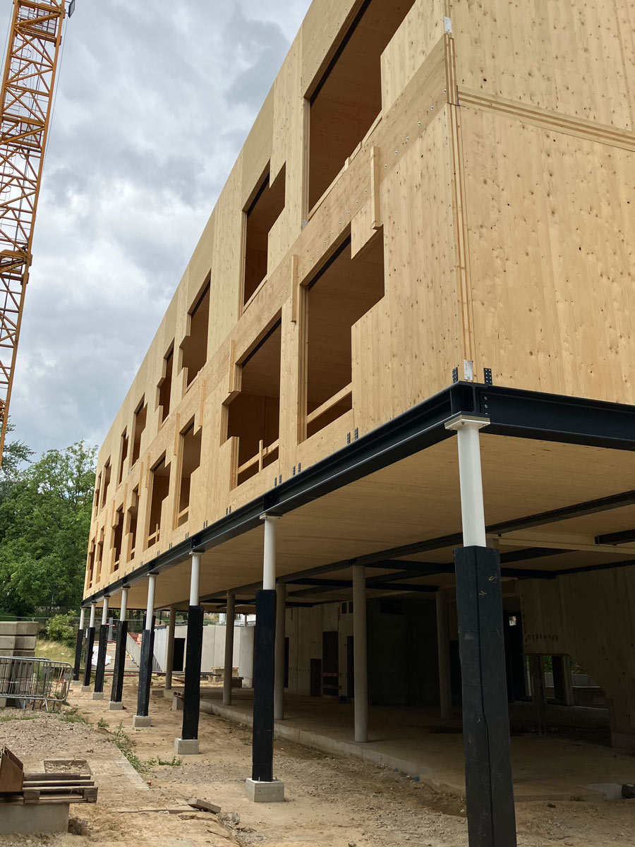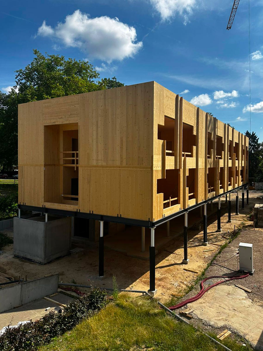 Les photos montrent un ensemble porté par une structure métallique surélevée, créant un rez-de-chaussée dégagé et lumineux. Les parois, planchers et cloisons en CLT composent des espaces intérieurs chaleureux, dotés d’une acoustique naturelle et d’un confort optimal pour les futurs élèves et enseignants. Les ouvertures généreuses assurent une belle lumière naturelle, tout en mettant en avant la flexibilité architecturale du CLT.