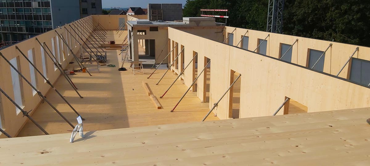Pour la nouvelle construction de l’internat autonome de Mouscron, AVLN a réalisé la structure porteuse en CLT (Cross Laminated Timber). Ce mode constructif répond parfaitement aux exigences d’un bâtiment scolaire : solidité, rapidité d’exécution et durabilité.