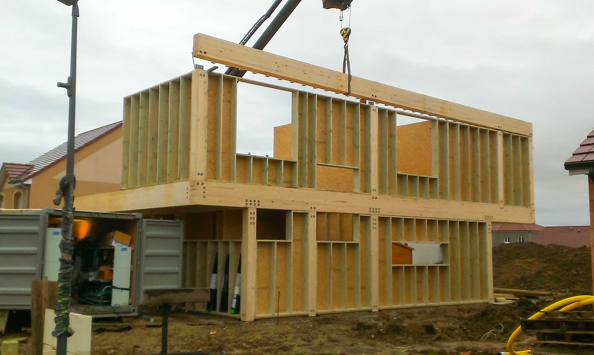 Sur place, la pose s’est effectuée à l’aide d’une grue mobile. Les murs et poutres en bois massif ont été positionnés avec rigueur sur la dalle béton. La structure révèle des lignes épurées et des volumes généreux, typiques d’une architecture moderne.