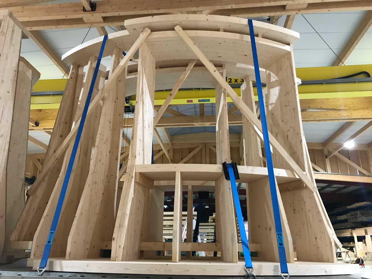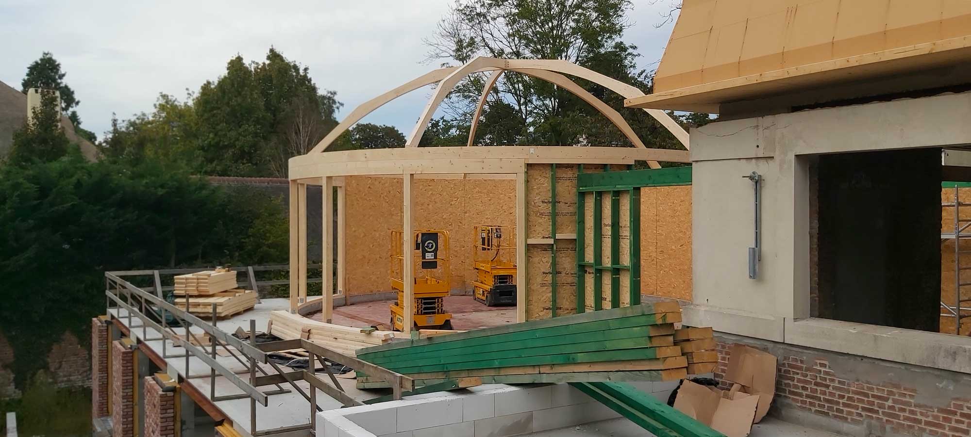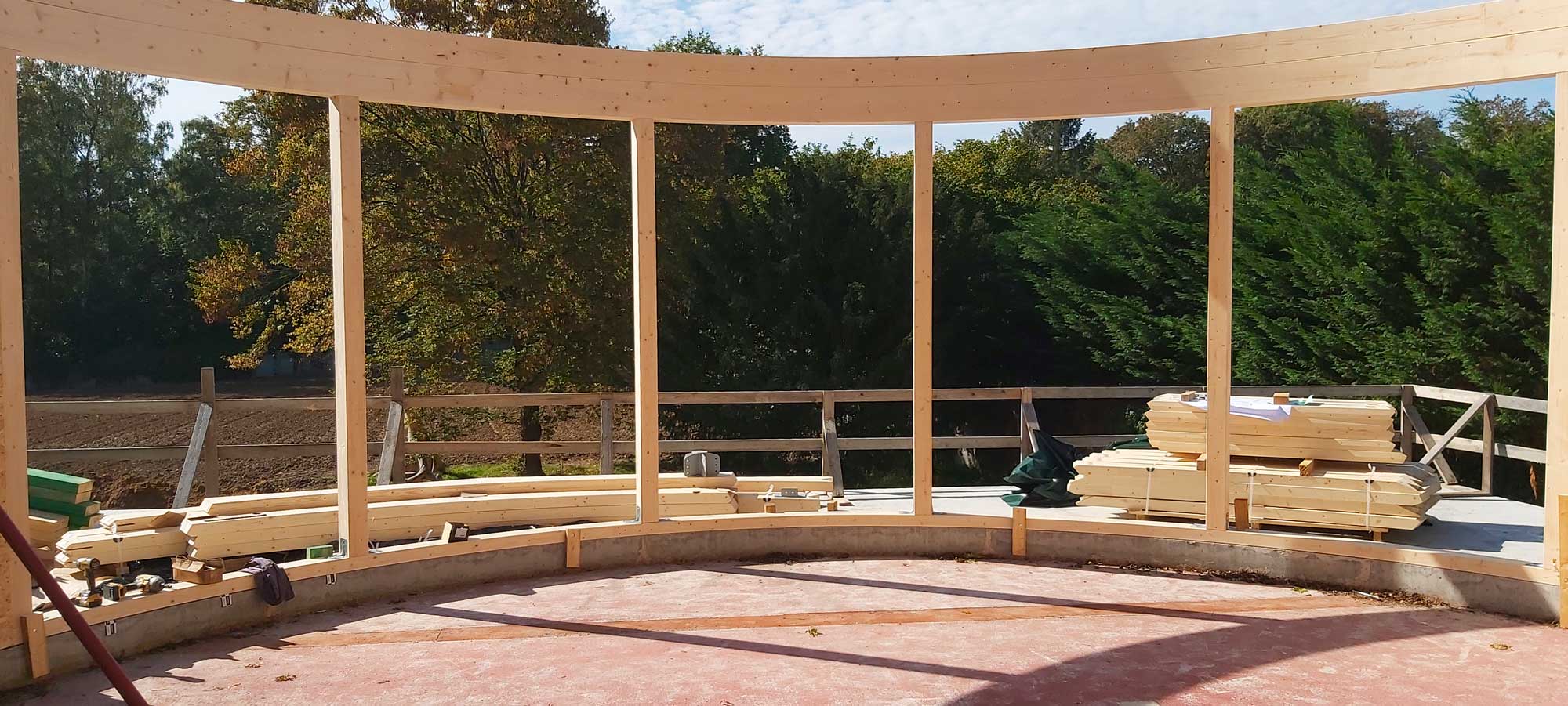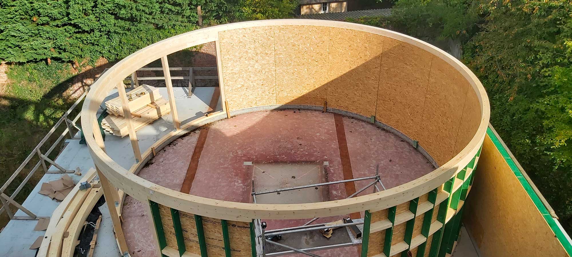 Le projet intègre également une structure spécifique en bois pour un espace circulaire, apportant une dimension architecturale forte. L’ossature bois offre ici légèreté, stabilité et liberté de formes.