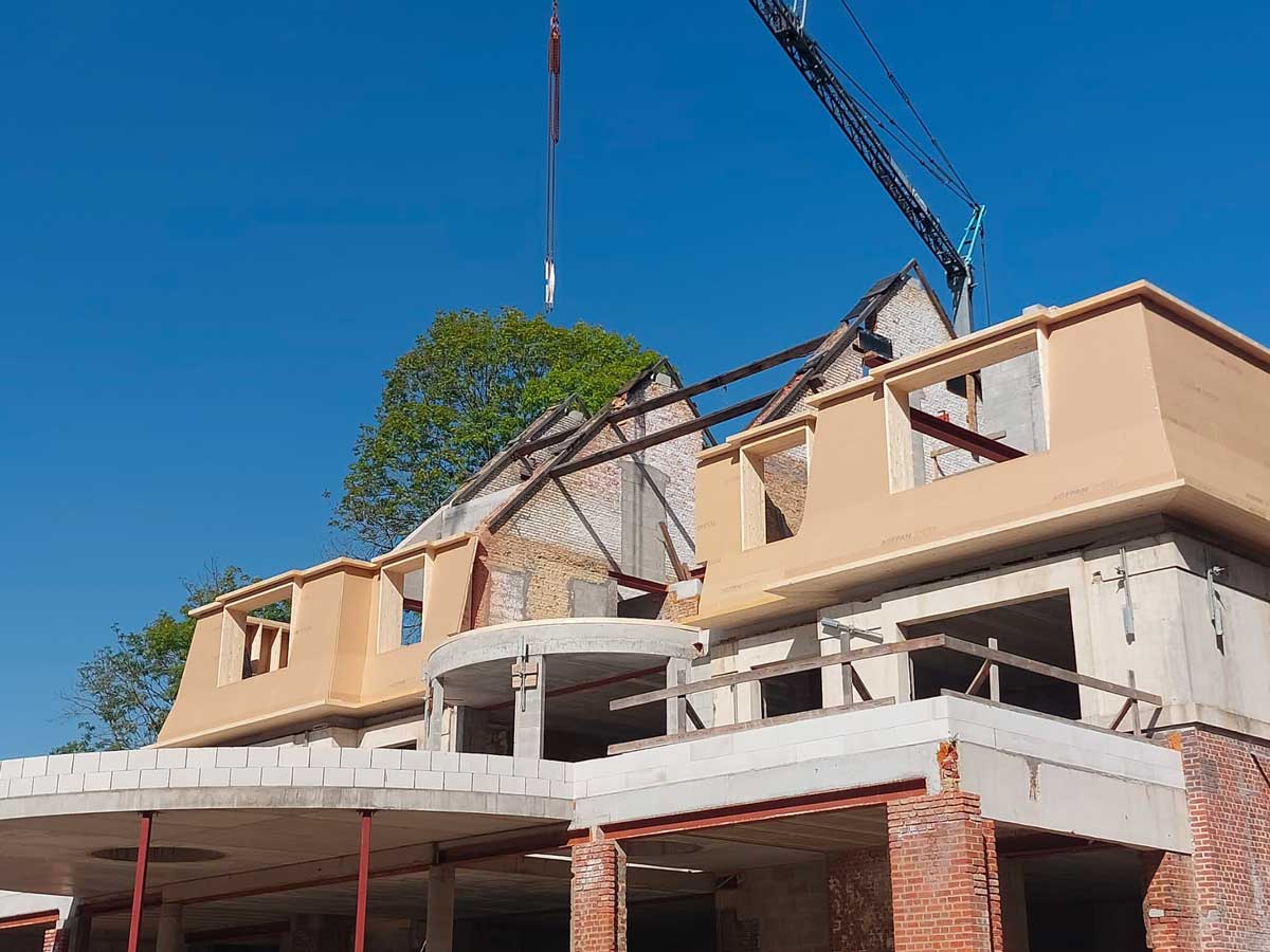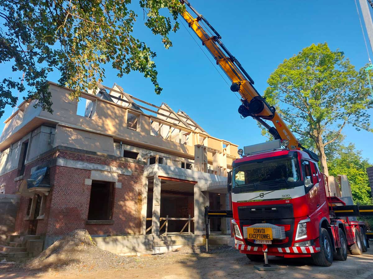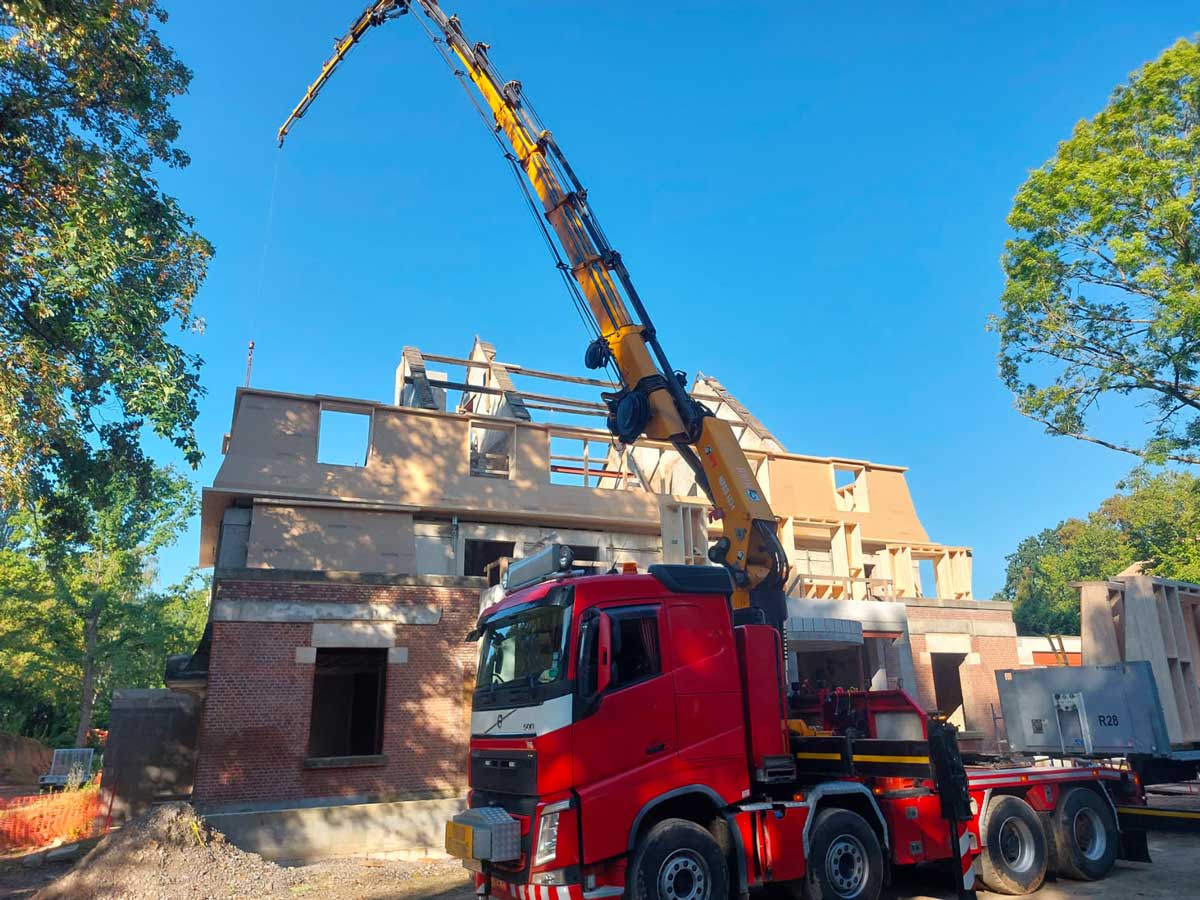 Sur site, la pose s’est déroulée à l’aide d’une grue mobile. Les murs à ossature bois ont été positionnés avec exactitude sur la dalle existante. Les volumes créés redessinent entièrement la silhouette du bâtiment, tout en respectant son architecture d’origine.