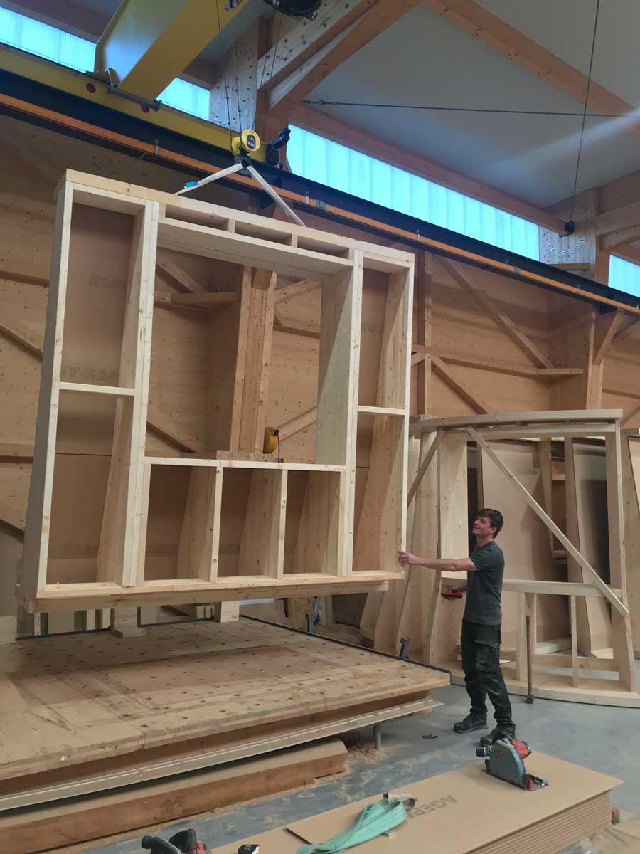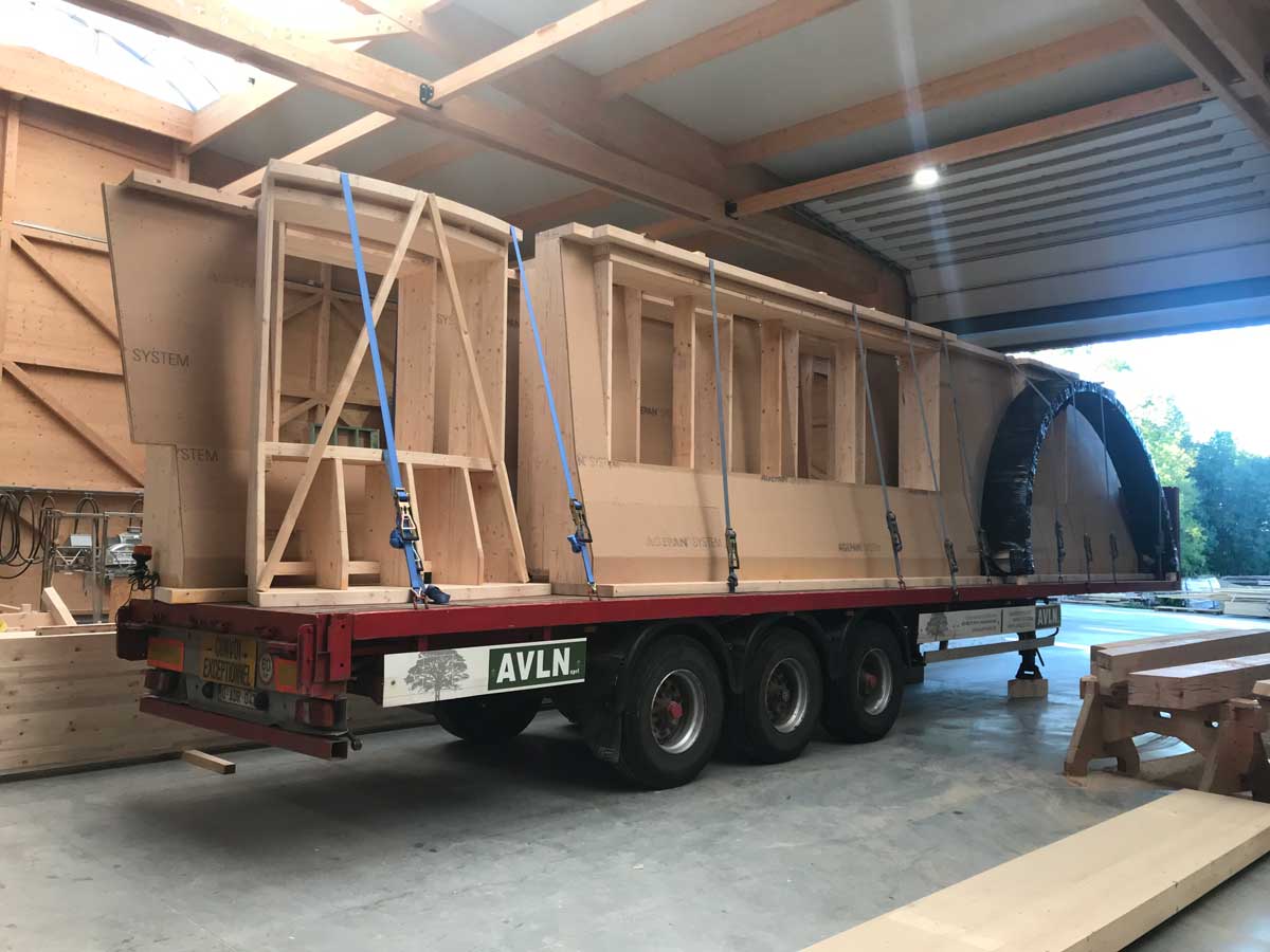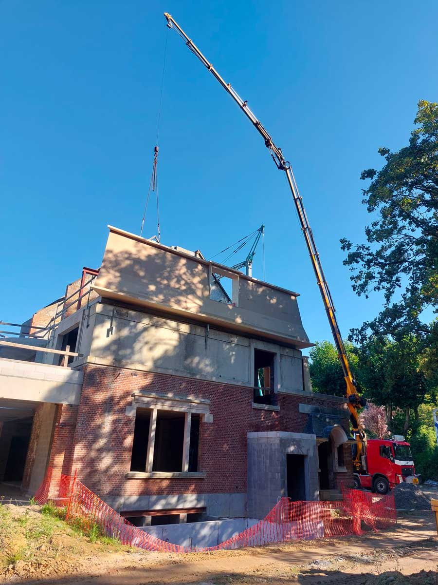 Sur site, la pose s’est déroulée à l’aide d’une grue mobile. Les murs à ossature bois ont été positionnés avec exactitude sur la dalle existante. Les volumes créés redessinent entièrement la silhouette du bâtiment, tout en respectant son architecture d’origine.