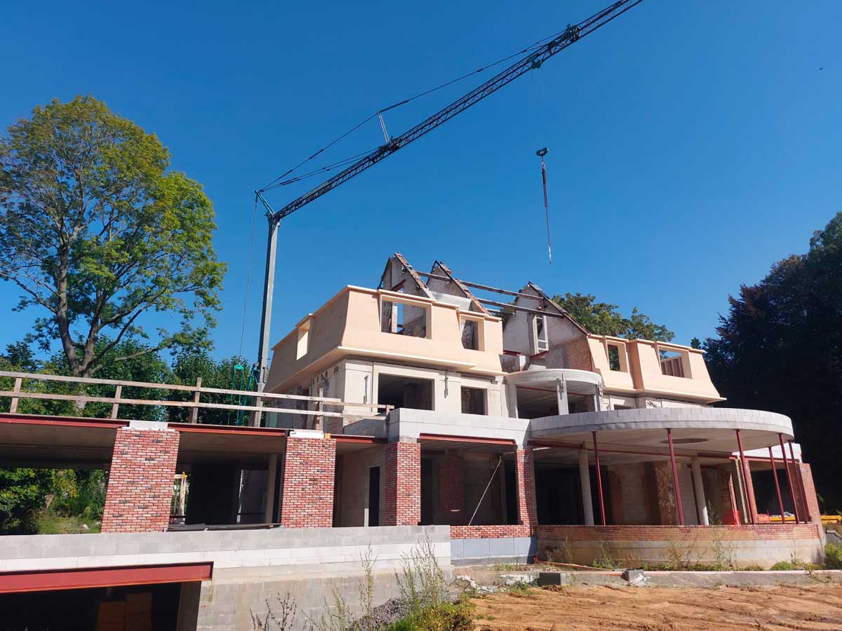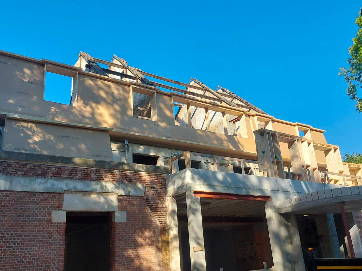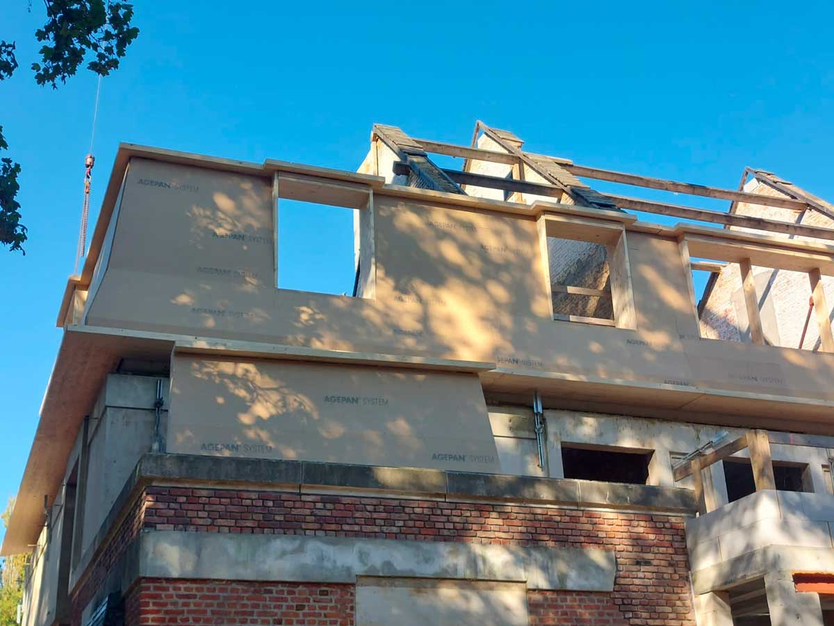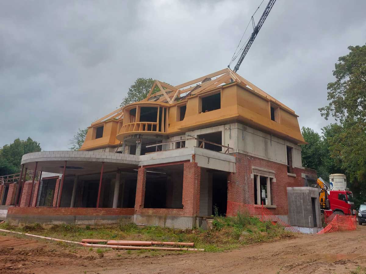 À Tervuren, AVLN a réalisé une ossature bois complète dans le cadre de la transformation d’une villa existante. Le projet combine surélévation et extension, avec une intégration précise sur une structure en maçonnerie conservée.